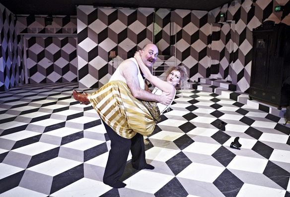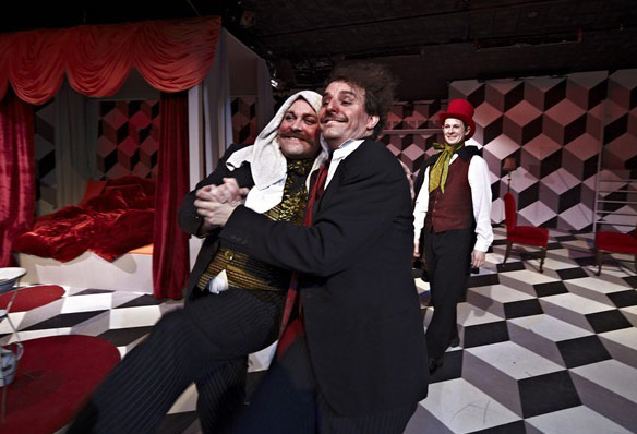 Det ender godt, selvfølgelig.Og det gør opsætningen i Odense så sandelig også. Bjarne Antonisen og Morten Christensen som de to bonkammerater er forrygende. Med vanvittige øjne, groteske grimasser, abrupte bevægelser og veloplagt turnerede replikker er de en fantastisk blanding af gamle stumfilm, Kjeld&Dirch – og det bedste fra den franske farcetradition. Antonisen som den bredvommede Lenglumé, Christensen som Mistingue med rødvinsnæsen og det opskruede hår. Omkring dem Hanne Hedelund som Lenglumés liggesyge og forståeligt mistroiske kone og Kasper Ørum som dels fedtet tjener, dels jovial fætter i pengeforlegenhed. Pragtspil over hele linjen – en forrygende dåd af instruktøren Lydia Bunk i Nadia Nabil Korsbæks storternede bedsteborgerhjem med de mange døre.