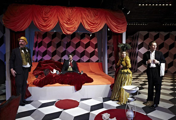 Es war ein regnerischer Abend, vielleicht liegt ein ganzes Jahrzehnt Fresserei und Zügellosigkeit dahinter, und der Kater wiegt schwer genauso wie die Schulden. Lenglumé, ein guter Pariser Bürger, stürzt raus aus seinem Himmelbett, das in Nadia Nabil Korsbæks hypnotischem Bühnenbild funktioniert wie ein Puppentheater im Theater.