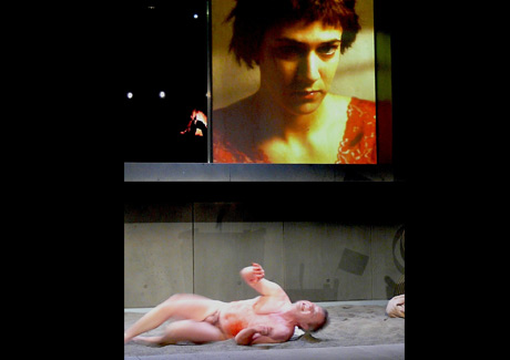 bis er am Ende blutig und nackt auf der Bühne liegt und sein Unrecht erkennt.