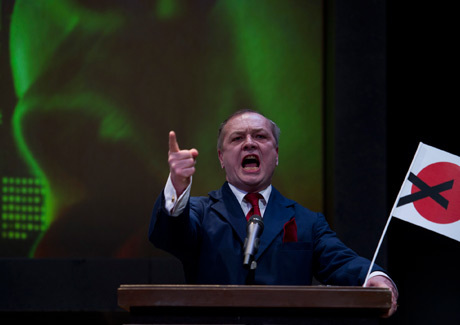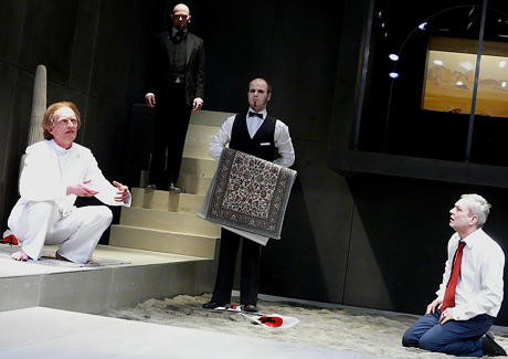 Ensemble umrahmt von einem Feng-Shui – Ort eines Wüstenpolitikers vom Bühnenbildner Nikolaus Porz – mit grauer Asche bestreute Podien und Zier-Kaktus, ein Pool aus Sand, ein Rednerpult und Stufen bis zum Glashaus mit Leinwand