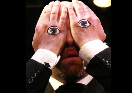 men synligt for os alle snarere for egen vindings skyld. Omkring dem et kor af ræsonnerende stemmer, her iklædt tjenerkostumer, med Bjarne Antonisens klogt afmålte korfører i front.