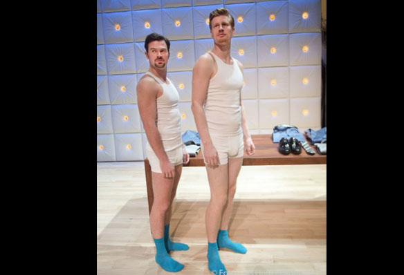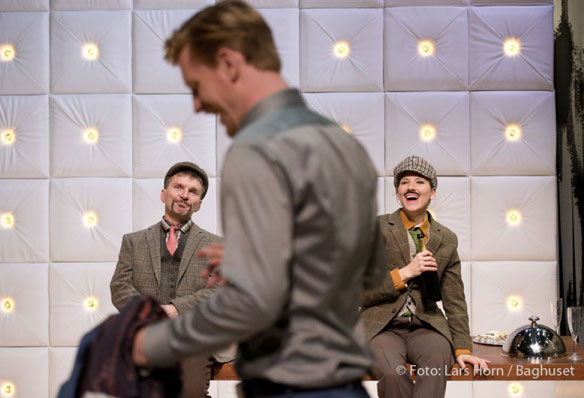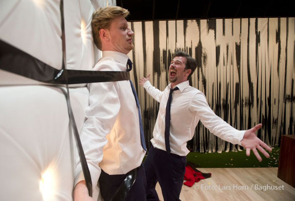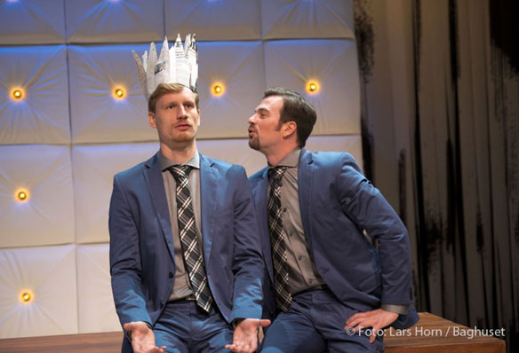 In der Inszenierung am Aalborg Teater steht er (Clavigo) selbstgefällig in seiner Unterhose da und ist bereit, sein makelloses Hemd und Krawatte anzuziehen. Sein zweites Ich begleitet ihn überall hin. Als zwei sich synchron bewegende Personen stehen der dunkelhaarige gelockte Martin Bo Lindsten und der große, blonde Andreas Jebro auf der Bühne als eine Person. Alles, was sie tun ist synchron. Sie sprechen synchron. Sie nehmen ihre Schuhe synchron. Sie schreien synchron. Es ist wirkliches Revue Timing und das heißt etwas. Mit Lindsten als unwiderstehlicher Verführer und Jebros zügellosem Zweifel in der gleichen Person. Tierisch komisch, aber dahinter liegt die Tragödie und der geistige Zusammenbruch lauert gleich um die Ecke. (...)