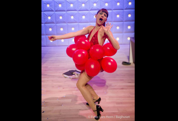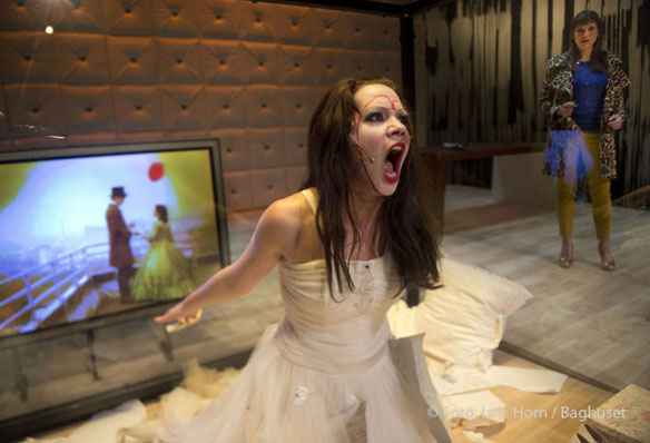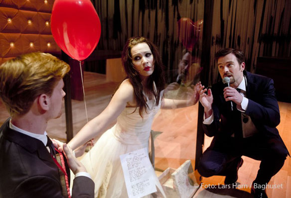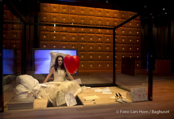 Schneewittchen könnte sich leicht in dem vergrößerten Glassarg befinden, der jetzt wie ein Mausoleum für Clavigos ermordete Liebe in der Mitte der Bühne steht. Im Inneren des gläsernen Sargs liegt die abgelehnte Schönheit Amalie Dollerup und singt ein trauriges Liebeslied mit einer so schönen und traurigen Stimme, dass selbst ein gehörloser Mensch es bedauern würde, und zu ihr zurückkehren würde und um Vergebung bitten. Sie schwebt umher in ihrem verweinten Hochzeitskleid, auch Malin Rømer Brolin-Tani als Schwester zeigt sich mit ebenso viel Charme in einer Cancan- Corsage . Welch glückseliger Seufzer des Unglücks!