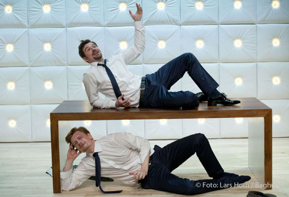 Man kann die Skizze von Goethes Alterswerk 'Faust' erahnen: Sein Freund und Kollege Carlos ist eine Mephisto Figur; Einer der in Versuchung führt und Zweifel sät.(...) Die beiden Männer werden mit hedonistischer Zügellosigkeit gespielt und effizienten synchronisierten Bewegungen von Andreas Jebro und Martin Bo Lindsten. Sie sind der Inbegriff des Homo ökonomikus . Lydia Bunk lässt sie oft im Chor sprechen oder einander benutzen wie Bauchrednerpuppen. Die Sprache der Macht ist körperlos und relativ.