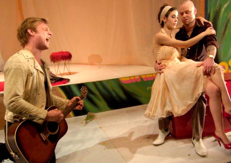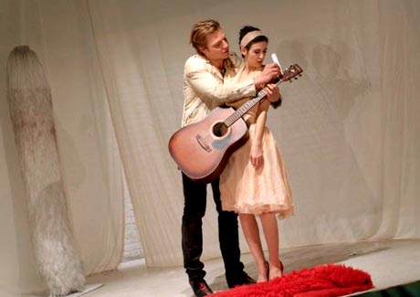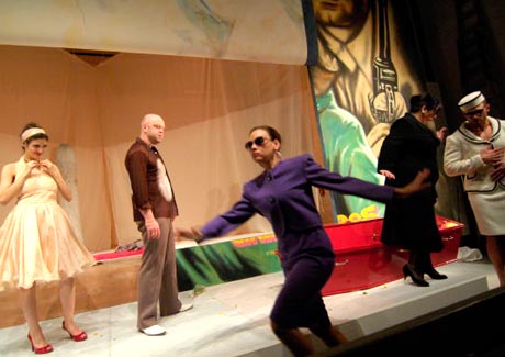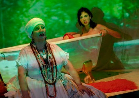 Das Bühnenbild überzeugt: Ein gigantisches Nostalgie-Filmplakat, das die Copacabana zeigt, weiße Strände, Favelas, den Zuckerhut von Rio de Janeiro sowie im Vordergrund zwei Filmstars und den Titel Boca de Ouro. Das spektakuläre Plakat (Bühne: Jana Findeklee und Joki Tewes) dient auch als Vorhang. Dahinter verbirgt sich eine Mischung aus Badezimmer und Autowaschanlage. In einer überschäumenden Wanne liegt der Vorstadtganove, Weiberheld und Mörder Boca de Ouro, der Mann mit dem goldenen Gebiß. Gespielt wird die gleichnamige Vorstadttragödie von Nelson Rodrigues, der als bekanntester brasilianischer Dramatiker gilt, ja, sogar mit Brecht verglichen wird. (…)