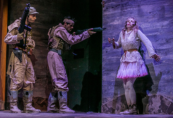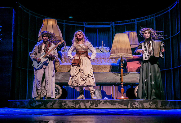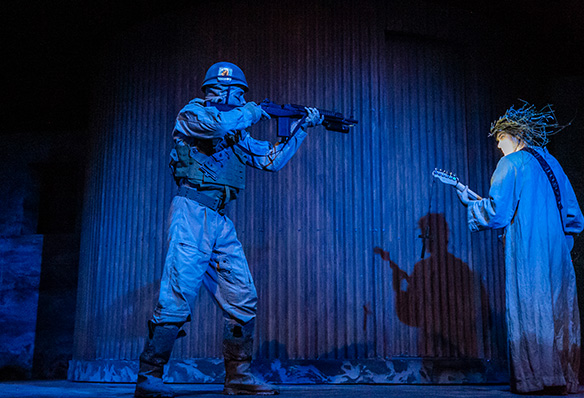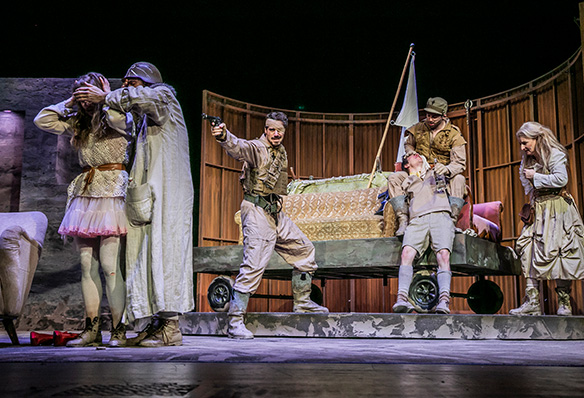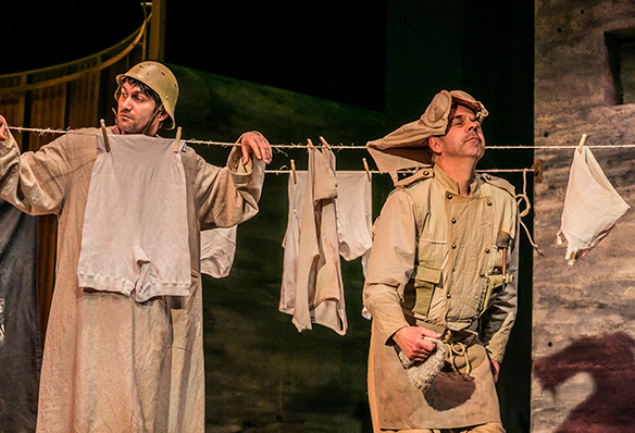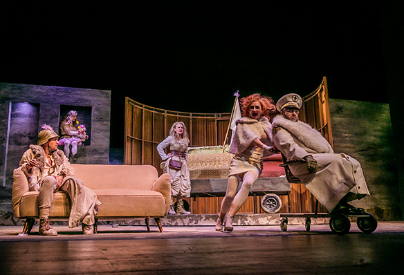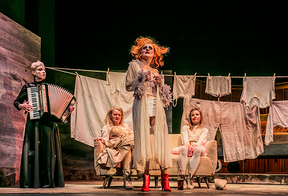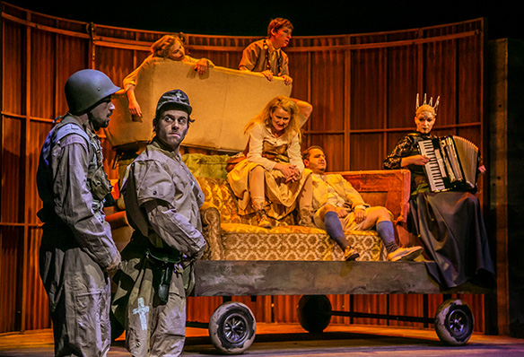 Das Stück hatte seine Deutschlandpremiere 1949 als erste große Regiearbeit Brechts am Deutschen Theater Berlin. 70 Jahre danach lässt sich jetzt am Theater für Niedersachsen (TfN) erleben, dass es nichts an Aktualität eingebüßt hat. (...) Schon in der ersten Szene lässt sich der älteste Sohn (in dieser und weiteren Rollen: Dennis Habermehl) gegen den Willen der Courage als Rekrut anwerben, ‚weil es sich rechnet'. Auch den zweiten Sohn (Tonio Schneider, der teils geradezu akrobatisch auftritt) und die Tochter (Lilli Meinhardt, die die stumme Figur körpersprachlich einfühlsam und beeindruckend spielt) opfert die Mutter dem Kriegsgewinn. (...) Diese Courage zieht kein Joch, sie wird gedreht, sie ist nicht (Kriegsgeschäfts-)Treibende, sondern nur Getriebene. Eine Opferfigur, in die sich wunderbar einfühlen kann, wer auch gegen Krieg ist. Dass diese Rechnung aufgeht, demonstriert bei der Premiere der begeisterte Applaus.