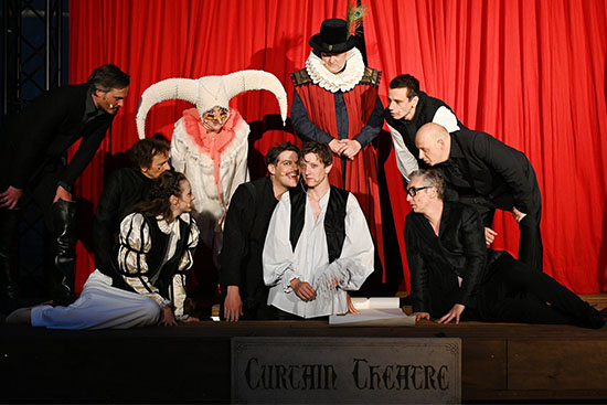 Zugleich erzählt das Stück eine herzzerreißende Liebesgeschichte, die auch in ihren erotischen Dimensionen erstaunlich freizügig dargestellt wird. (...) Pralles Komödianten-Leben, genüsslich überzeichnete Charaktere und ein Feuerwerk zündender Regieeinfälle zeichnen die Inszenierung von Lydia Bunk aus. Thorsten Bleich an Laute und Theorbe, Sabine Kreutzberger und Franziska Finkh an der Gambe und die Sängerin Juliane Blum versetzen das Publikum musikalisch in die Zeit der Renaissance.Zu den besonderen Effekten zählen ausgedehnte Fechtszenen mit Slapstick-Einlagen (Choreografie: Jan Lennart Krauter). Urkomisch, skurril und ungemein wandlungsfähig agierten auch Jonathan Bruckmeier, Michael Laricchia, Holger Stolz, Ron Spiess, Hendrik Pape und Patrick Schadenberg als mehr oder weniger dilettantische Theaterleute.In weiteren Rollen und üppigen, fantasievollen Kostümen von Bianca Deigner sind Catharina Kottmeier als Amme und Narr, Stefan Roschy als Lord Wessex sowie Sophia Platz als Königin Elisabeth zu erleben - und der Hund Tika. Der spielt deshalb mit, weil die Königin unbedingt einen Hund auf der Bühne sehen will. Eine wirkliche Rolle spielt er nicht. Er spielt nur sich selbst – so wie in dem Stück eben die Theaterwelt sich selbst spielt."