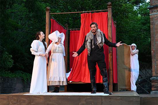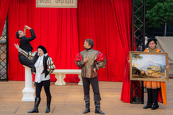 "Pralles Leben, Jahrmarkt-Atmosphäre mit Gauklern und Komödianten. Das ist der Boden, dem die Werke William Shakespeares entsprossen sind. Folgerichtig empfängt das Theater Baden-Baden die Besucher der sommerlichen