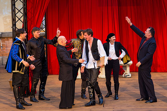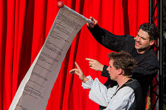 Eine wunderbare Einstimmung auf das Riesenspektakel, das sich im herrlichen Ambiente von Altem Dampfbad, Friedrichsbad und Florentinerberg abspielt. Ein Spektakel, das voller Witz, Klamauk und Slapstick steckt, intelligent gemacht ist und die Schauspieler zu Höchstleistungen treibt. Allen voran Kilian Bierwirth als Will Shakespeare und Clara-Luise Bauer als Viola de Lesseps alias Thomas Kent. Eine Traum-Besetzung.